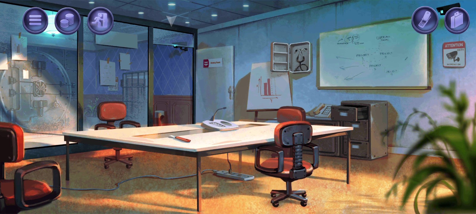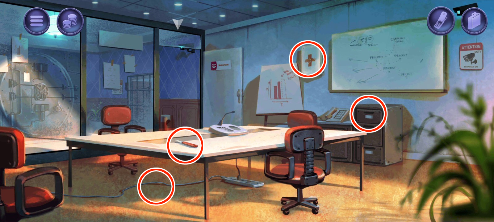 - 회의실 안에서 하드 드라이브, 전기 코드, 커터칼, 청진기 획득
