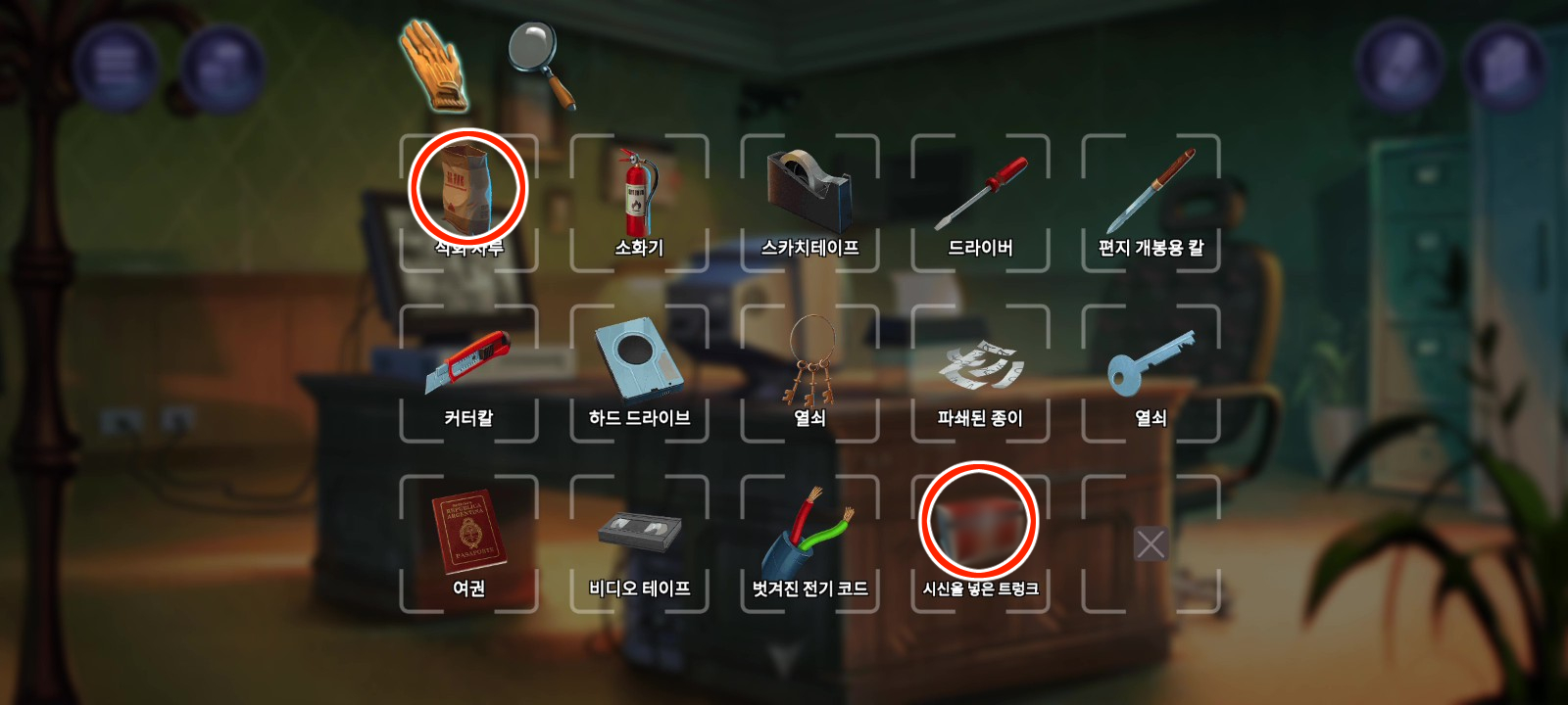 - 사무실 안 열쇠에 자석을 단 코드 사용 → 열쇠(금) 획득