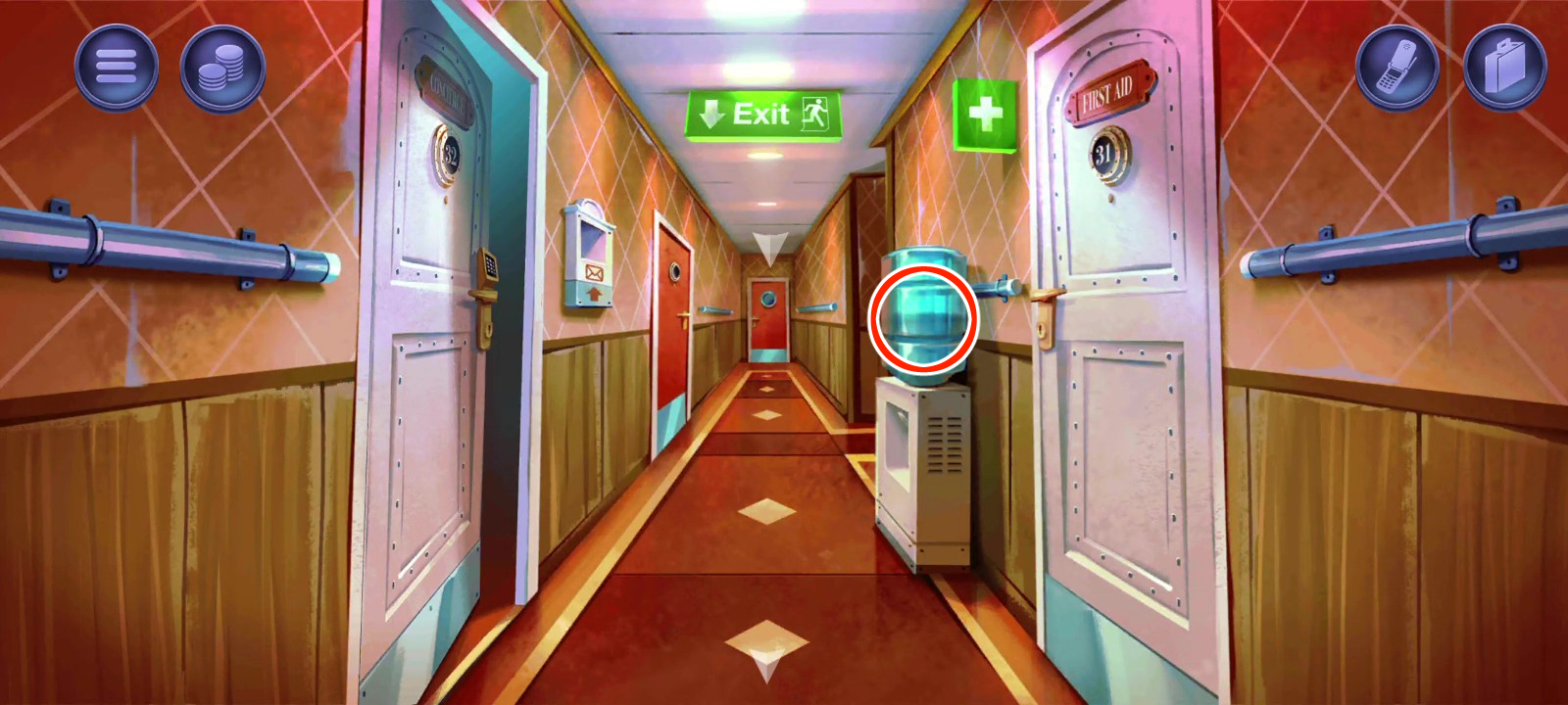 - 1층 객실 복도에 가 정수기에 전기 주전자 사용 → 물을 채운 주전자 획득