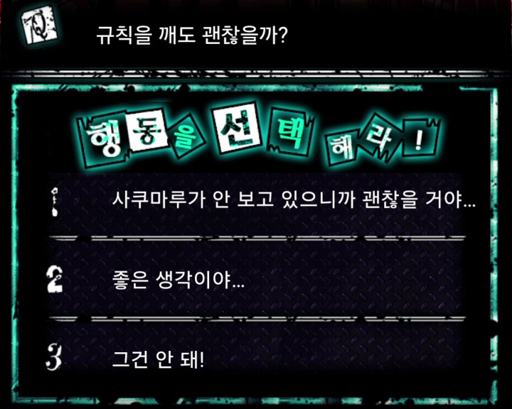 좋은 생각이야... ▶ 질문 반복 사쿠마루가 안 보고 있으니까 괜찮을 거야... ▶ 질문 반복 시간초과 ▶ 질문 반복