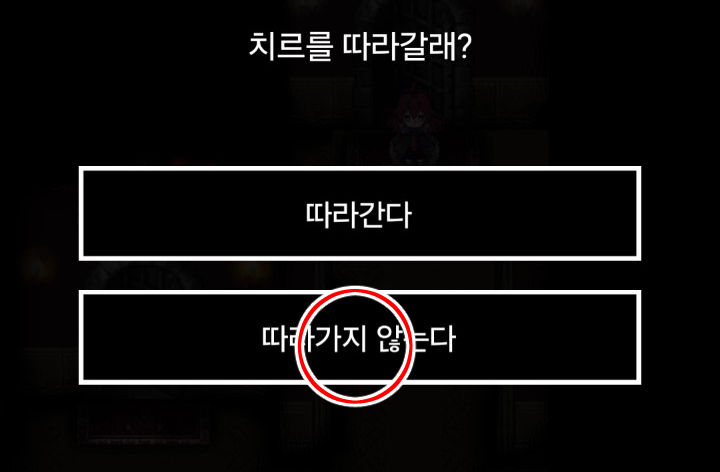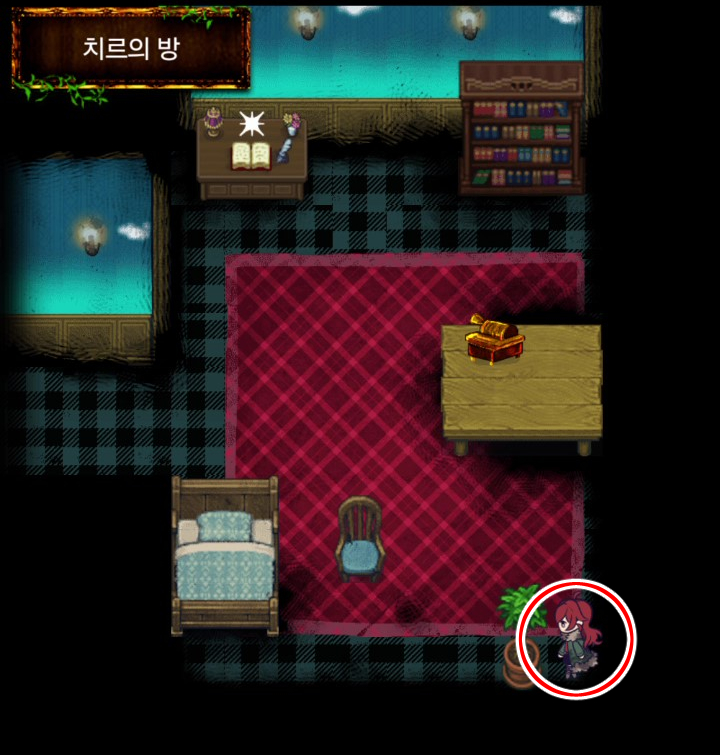 복도로 나간다 → 따라가지 않는다 → 치르의 방 진입 → 안쪽 치르의 일기 조사 → 오르골 조사 → 아래 화분 뒤에 숨는다