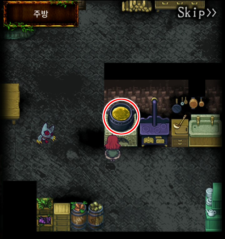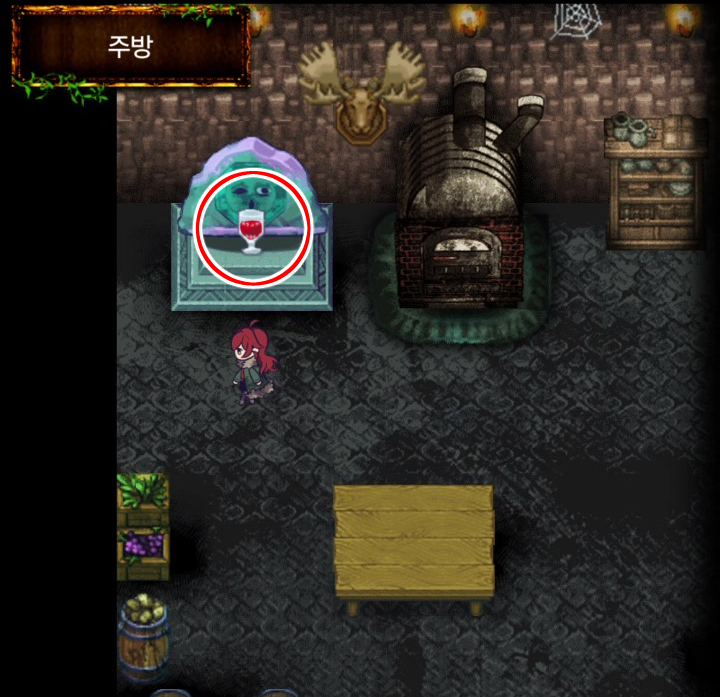 거실주방 진입 → 주방 제단 위의 빨간술 조사