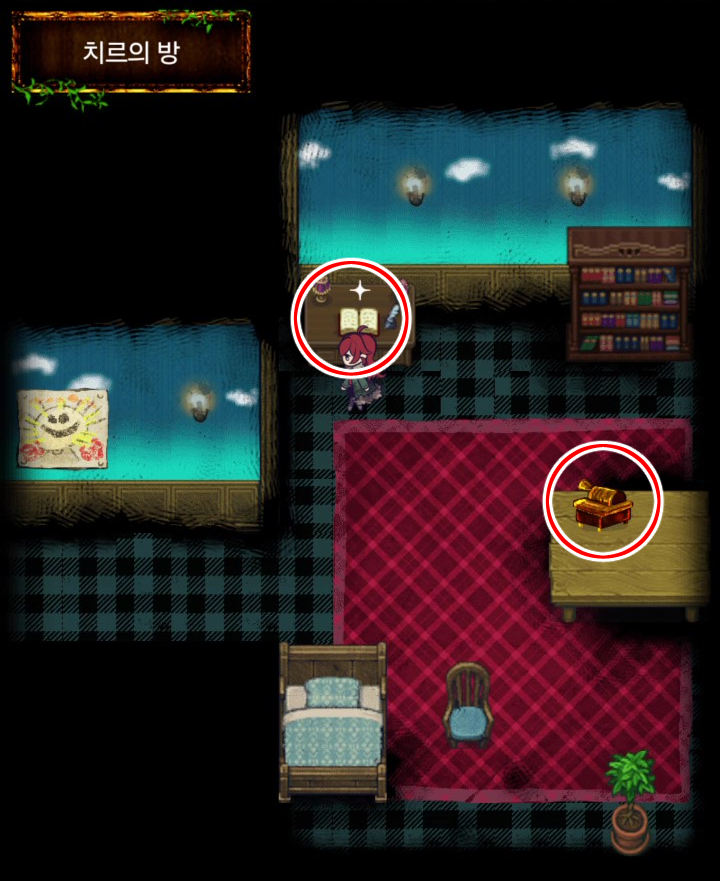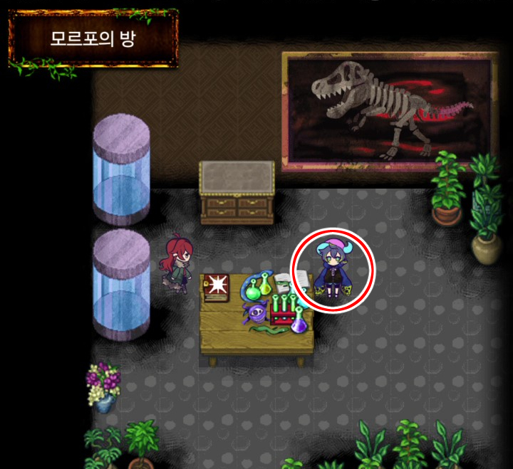모르포의 방 진입 → 모르포와 대화 → 2층 복도 선반 : 조사한다