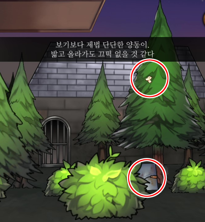 - 쪽지가 걸린 나무 밑에 양동이를 두고 빗자루 사용 → 종이조각 획득