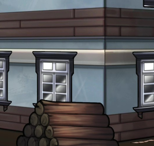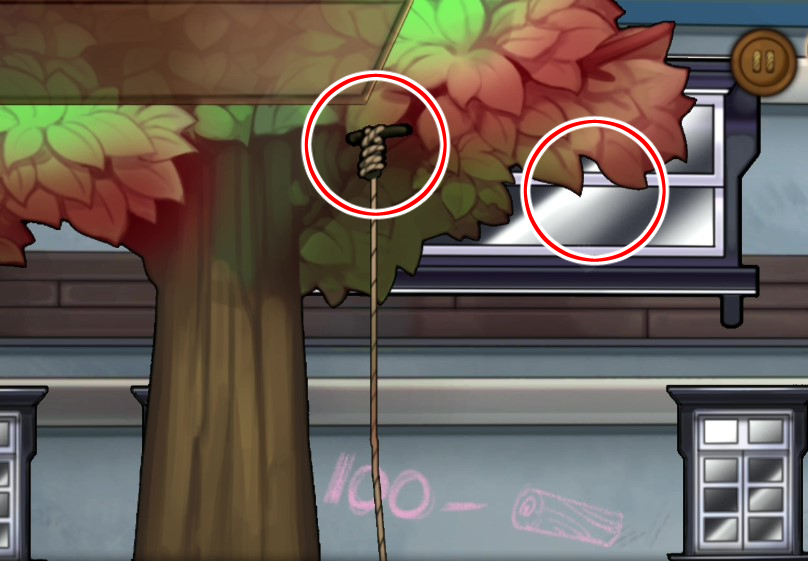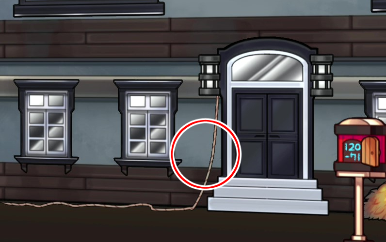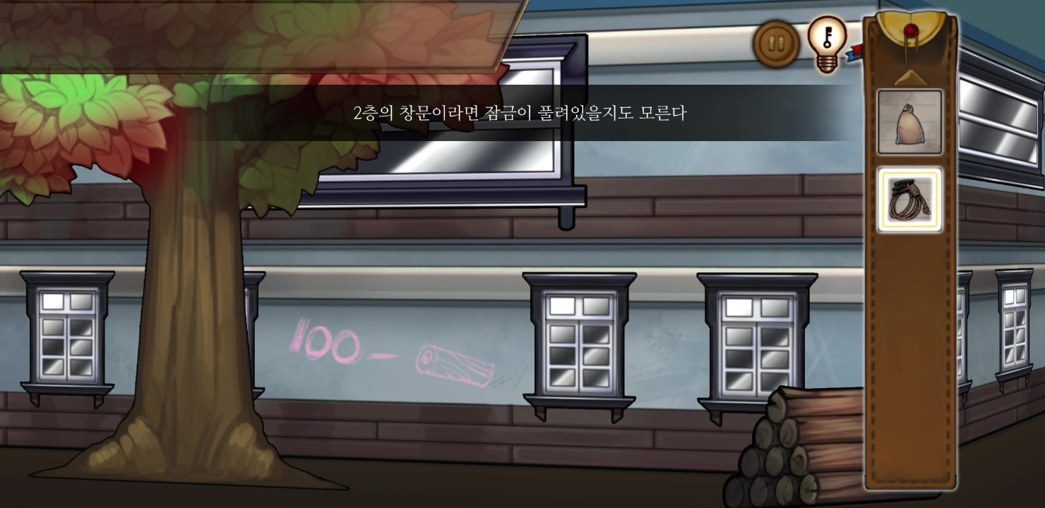 - 분홍낙서 앞 큰 나무에 밧줄을 묶은 쇠스랑 사용 → 바로 옆 2층 창문으로 진입한다