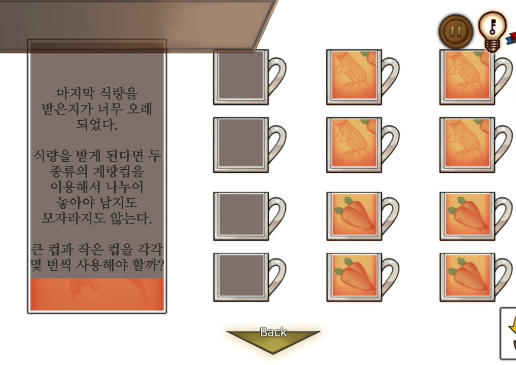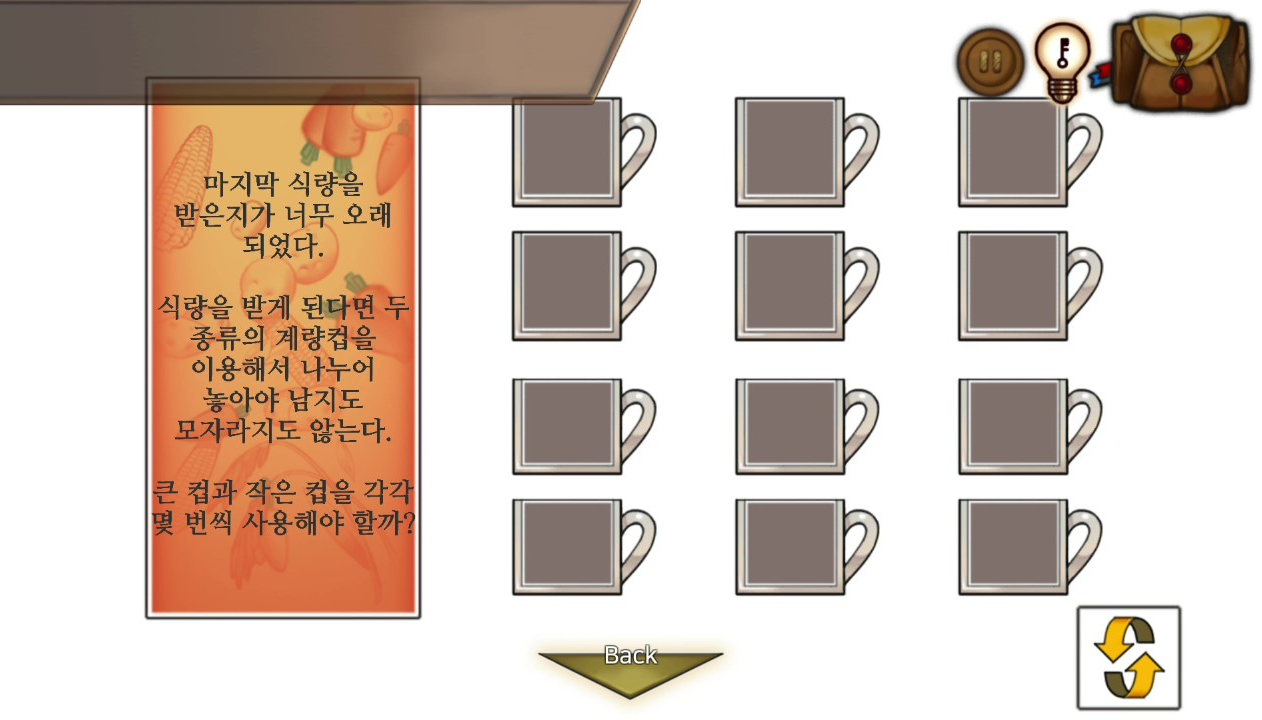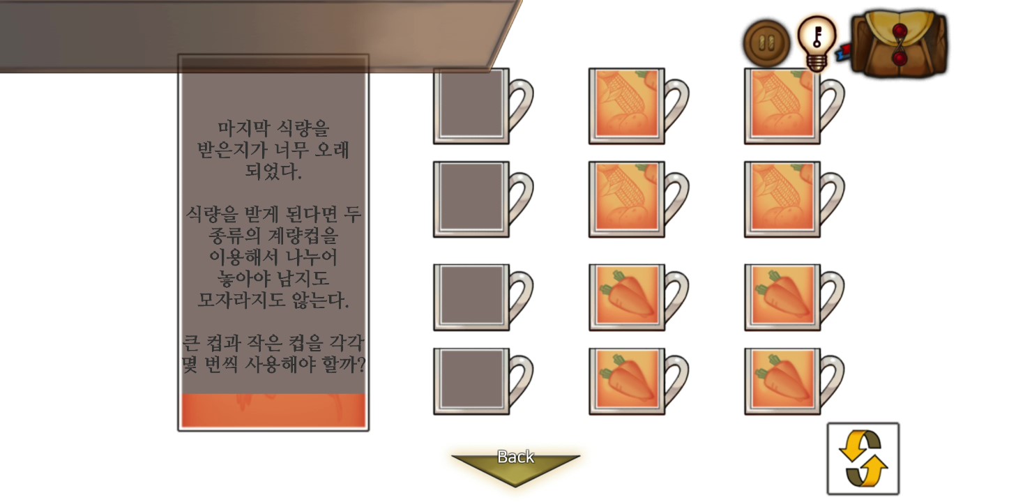 - 싱크대 자물쇠는 병에담긴 식량을 큰컵과 작은컵에 딱 맞게 나눠담으면 열린다 → 냄비 획득