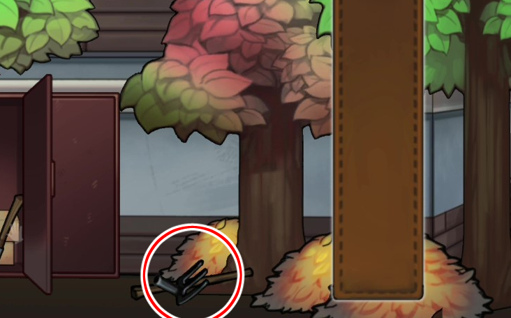 - 캐비닛 앞 낙엽더미를 치워 쇠스랑 자루를 찾는다