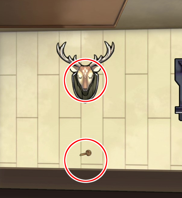 - 나무용 끌, 장난감 세 개 획득, 사슴머리를 흔들어 열쇠 획득