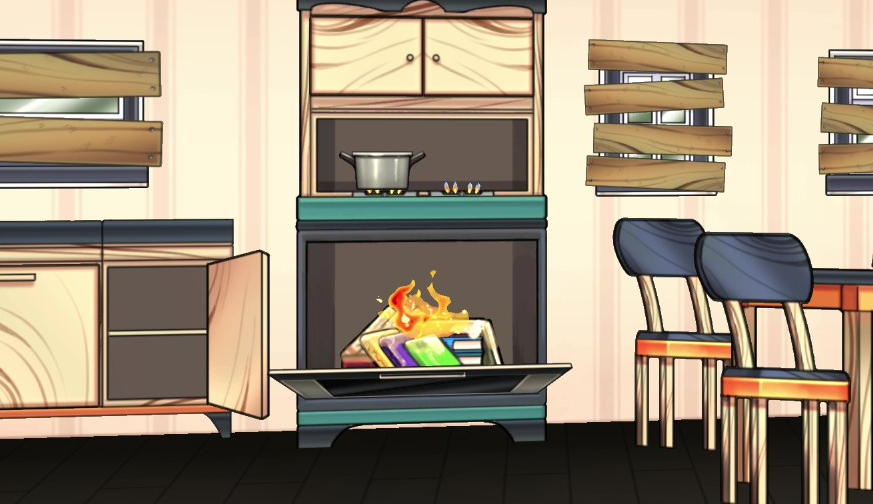 - 스토브 위에 냄비를 올린 후 스토브 안에 책더미, 휘발유, 촛불을 사용해 불을 붙힌다