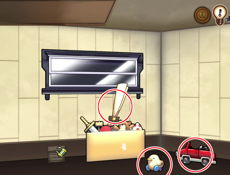 - 잠긴 문에 끌, 각종 장난감, 장난감 자동차 사용 → 회색 열쇠 획득