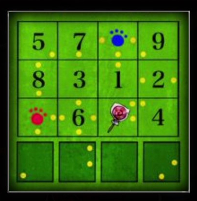 숫자판에서 노란 점의 위치가 게 배열하면 [ 9 / 사탕(3) / 3 / 빨간발바닥(4) ] 이 된다