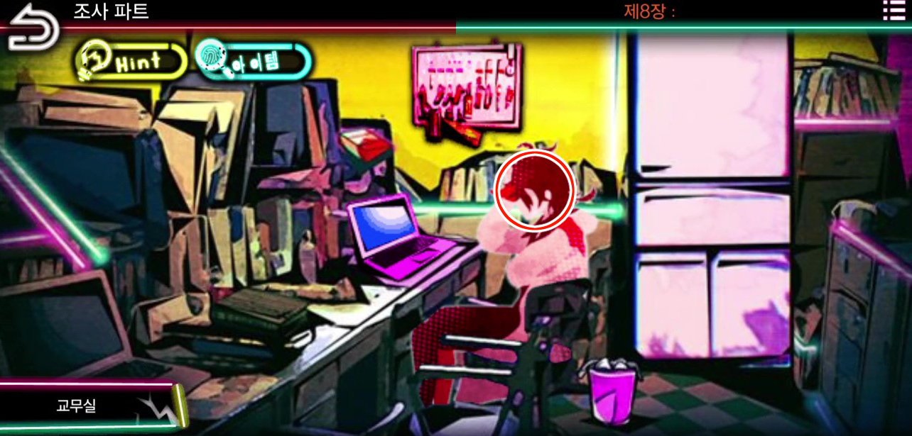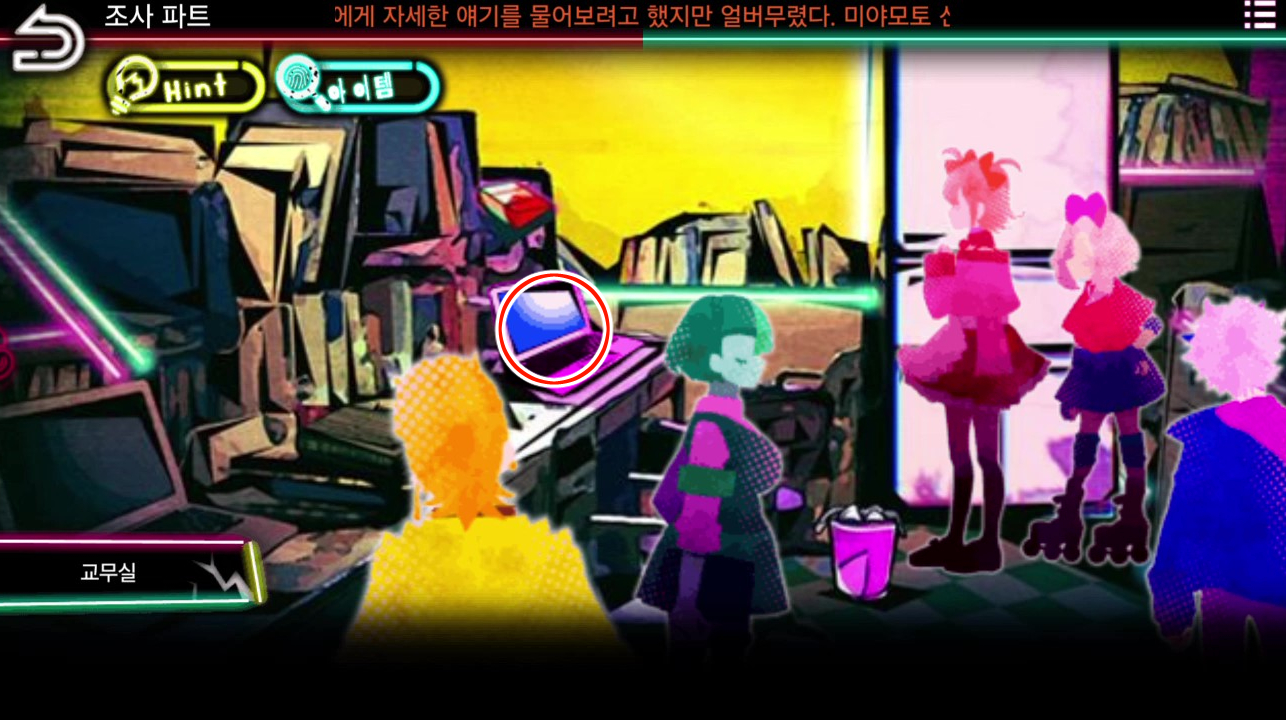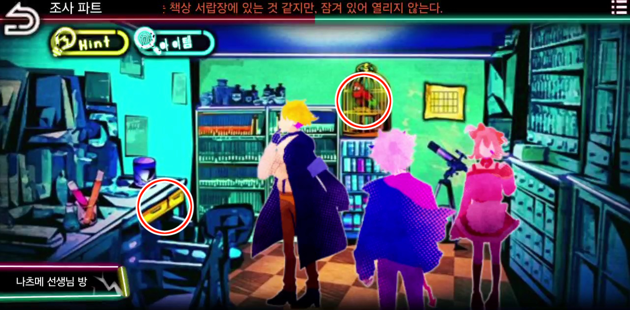- 새장 속 앵무새 조사 → 앵무새를 재조사하면 힌트를 준다