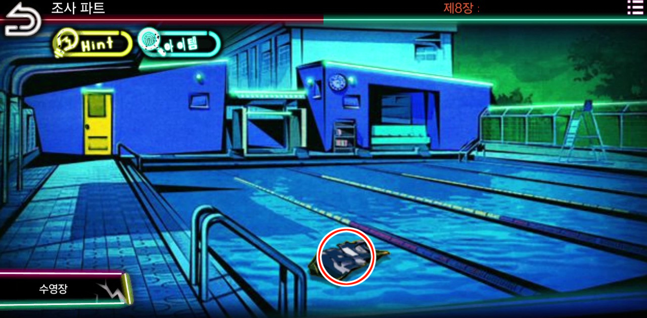 - 체육관 중앙에서 수영장 진입 → 수영복 조사