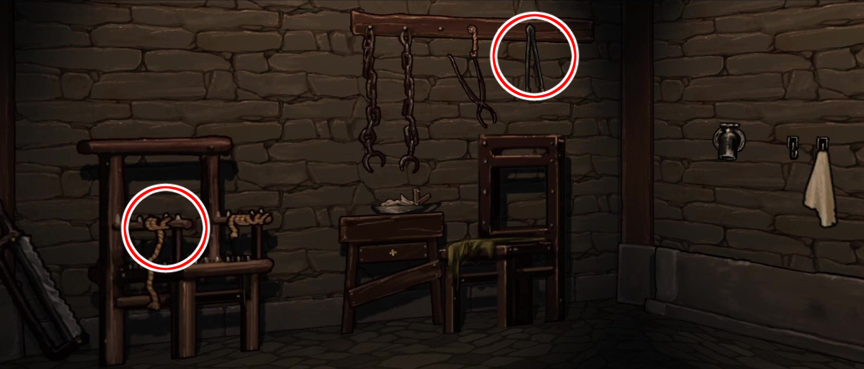 - 안쪽 벽걸이에서 집게, 의자에서 밧줄 획득