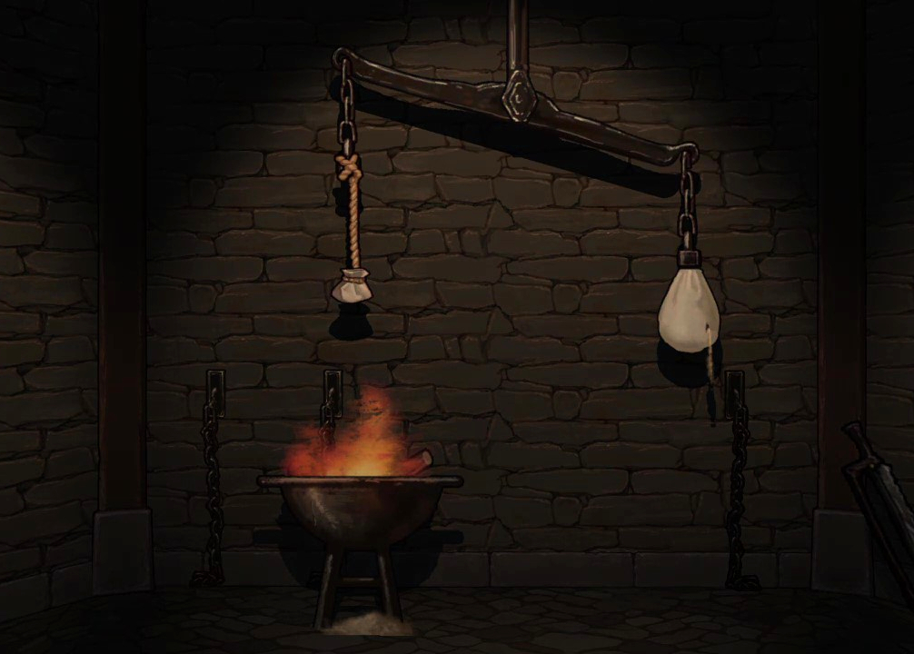 - 열쇠로 화로를 열어 장작을 넣은 후 구멍난 모래주머니 아래로 옮긴다
