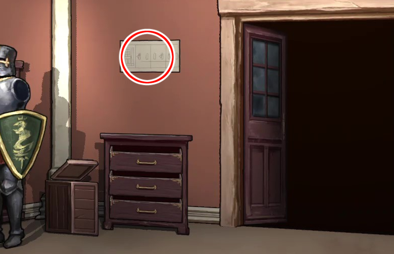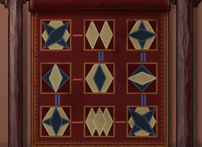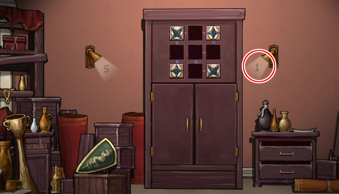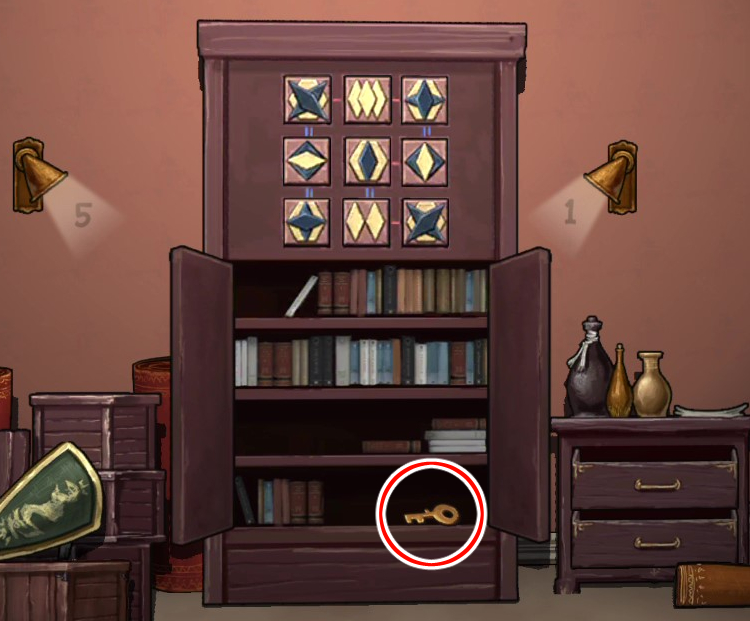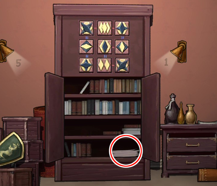 - 천에 그려진 그림을 토대로 옆방 책장에 나무조각 5개를 사용하여 퍼즐을 푼다