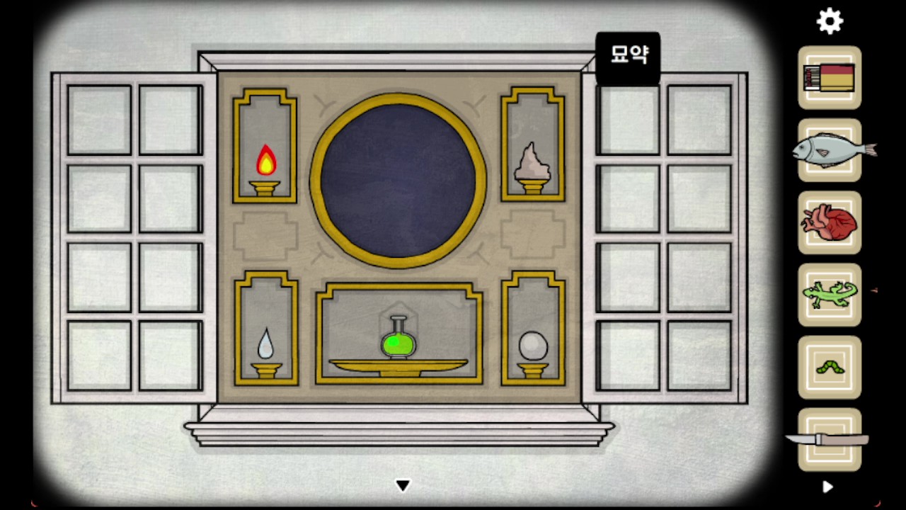 - 촛대에 물, 불, 공기, 모래를 놓고 접시위에 묘약을 놓아 진입